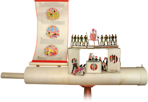 This life sized pop-up sculpture, in the shape of a telescope, satirises the relationship between two forms of government; a Republic and a Monarchy. In drawing together references from Machiavelli (his characterisation of the 'cycle of revolution': the rise and fall of all forms of government), the French Revolution (the ascendancy of the Third Estate and the subsequent Terror), and the appropriation of American cartoons and corporate logos, the project aimed to critique the shift in political power from state to corporation in the latter part of the 20thc.