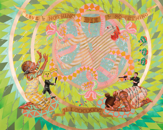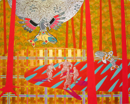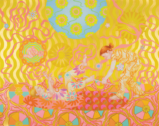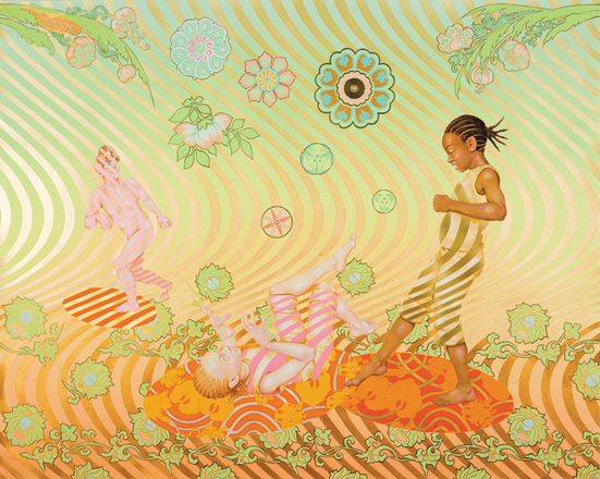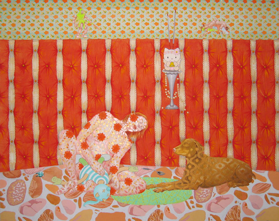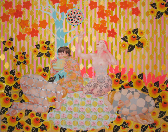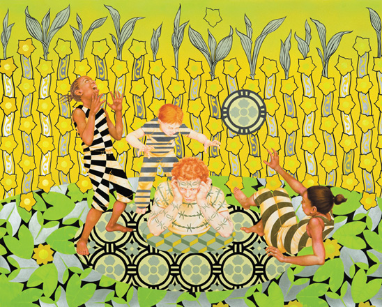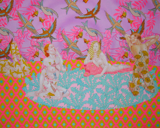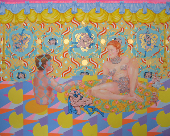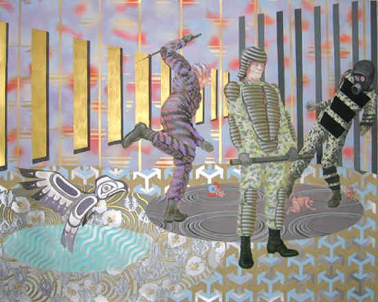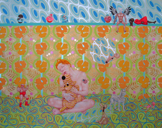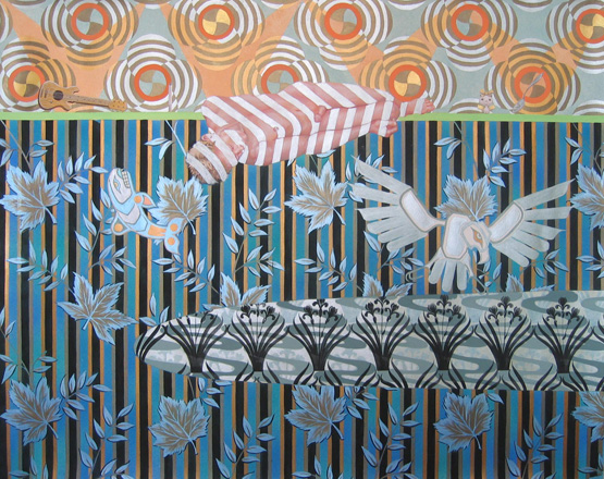 This series of paintings attempts to point up an aspect of our ethical experience of the world by mapping the human habit of obfuscating, re-describing or embellishing, the ‘brute reality’ of social experience; the qualities of say, violence, cruelty or menace, greed or power etc. Hence, the series title: It’s a Wallpaper World is to say, it’s a knowingly falsified world.